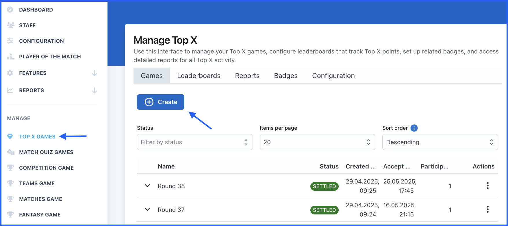 - Click the blue Create button located at the top of the Top X Games management page