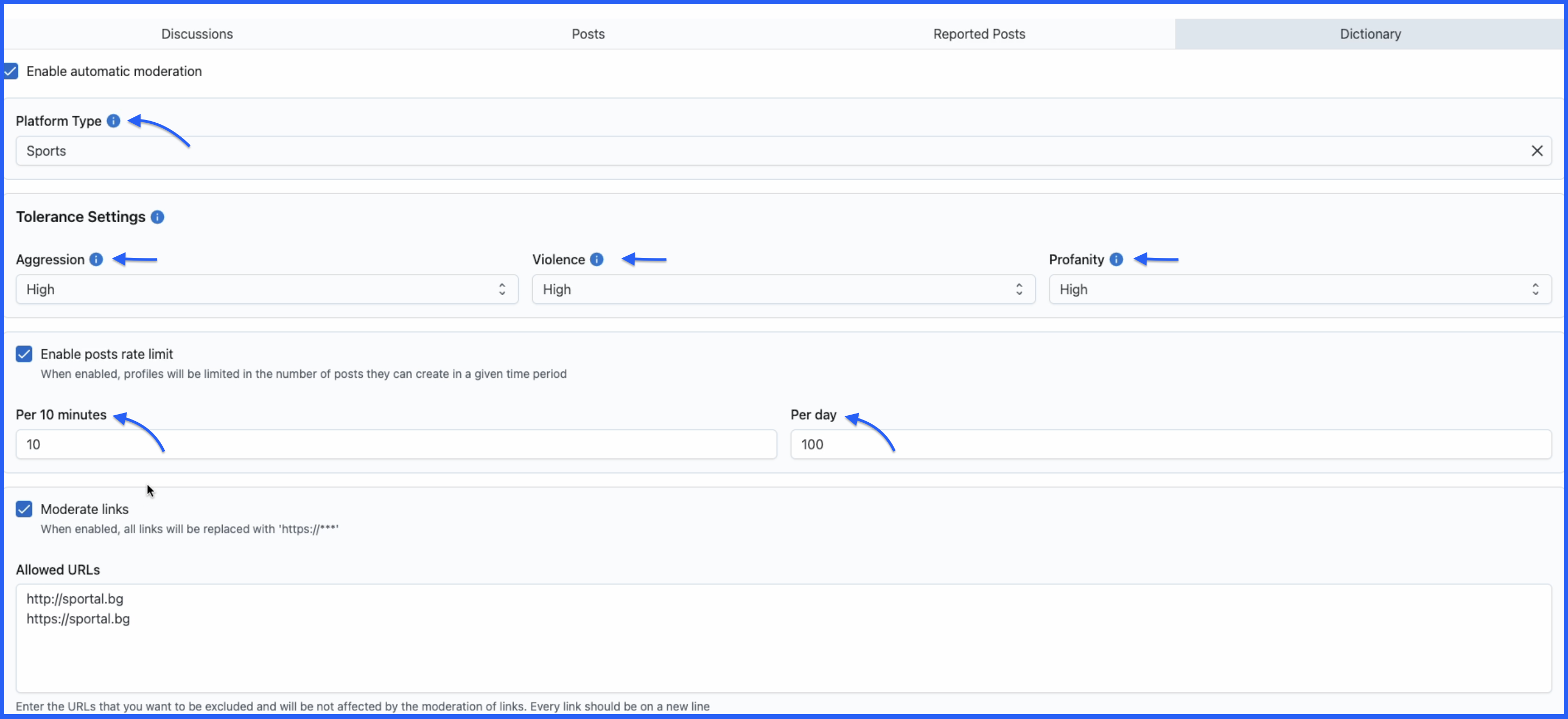 - Smart Platform Type Recognition - Choose your industry type (Sports, Gaming, Betting, News, Finance, etc.) and our AI automatically adjusts its understanding to your audience's communication style for more accurate moderation decisions.