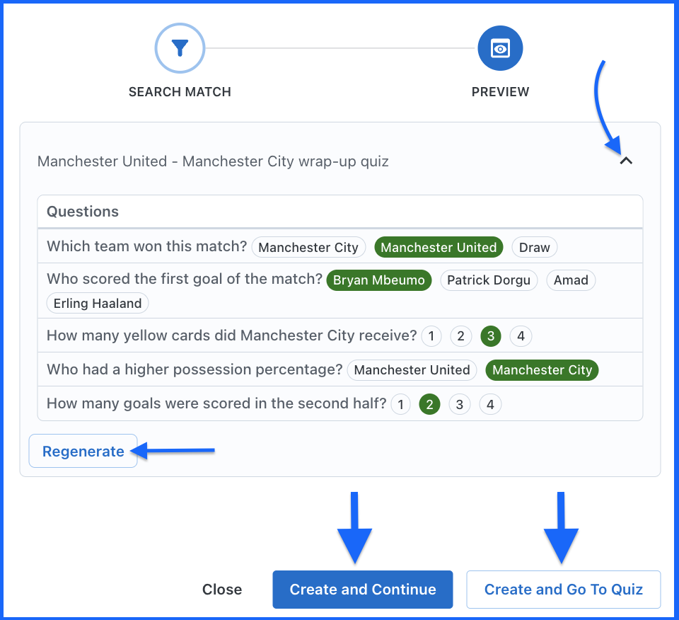 Football Post-Match AI Quizzes are Classic Quizzes based on real football matches. The AI pulls actual match data from Sports APIs—including match results, goal scorers, cards, timing, and key moments—and generates relevant questions for you. This allows you to publish timely, engaging quizzes after matches end without manually writing questions. Simply select a match, click generate, and your quiz is ready in seconds!