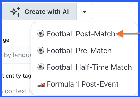 Click the Create with AI button to open the dropdown menu. Select Football Post-Match Quizzes