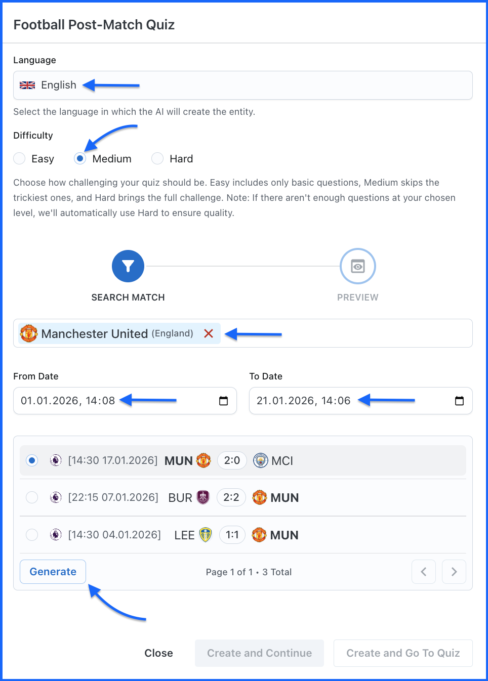Configure your quiz settings: Select your language from the dropdown, choose the difficulty level, search for a team & set your date range. The system displays all available matches within your criteria. Select the match you want by clicking the radio button next to it. Click the Generate button at the bottom.