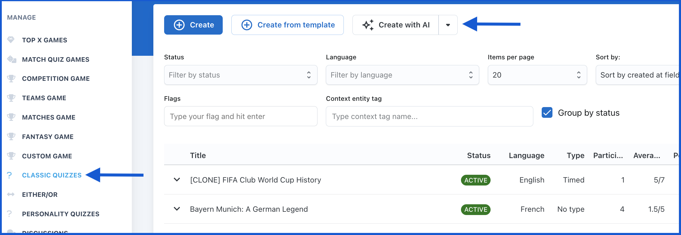 Open your management portal and click on Classic Quizzes in the left sidebar. At the top of the page, locate the Create with AI button.
